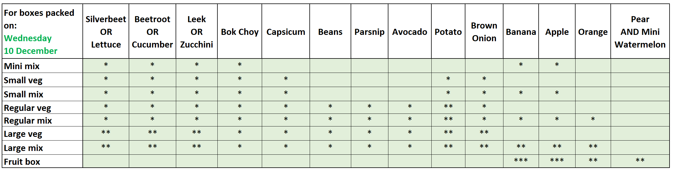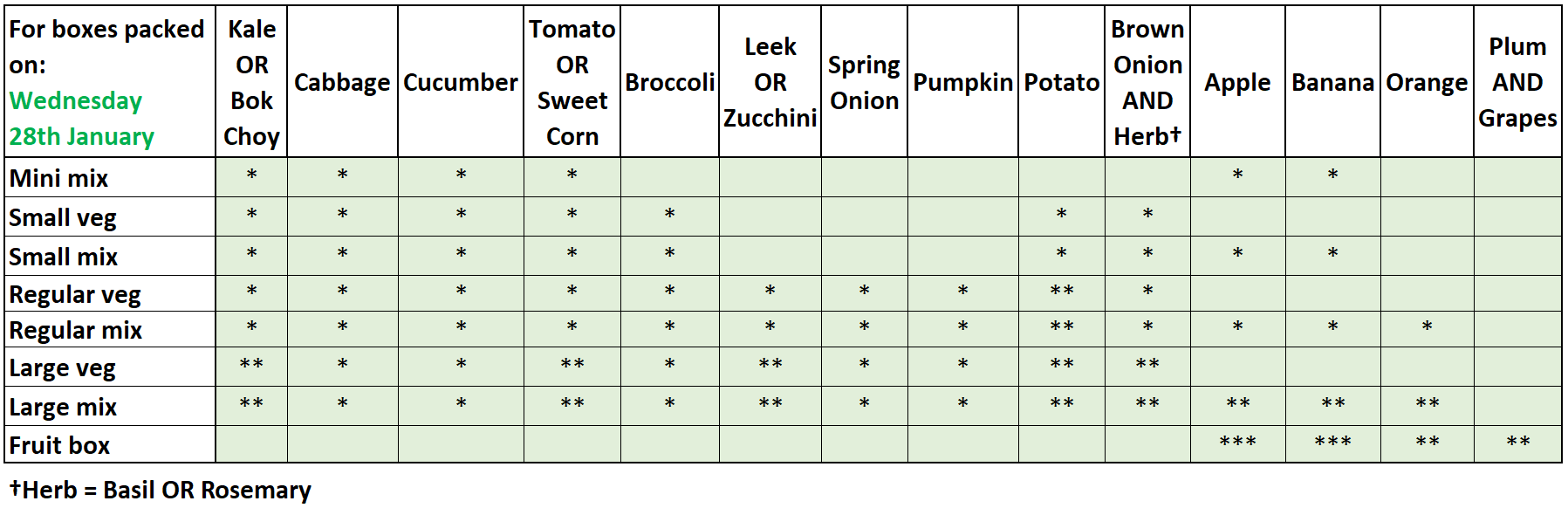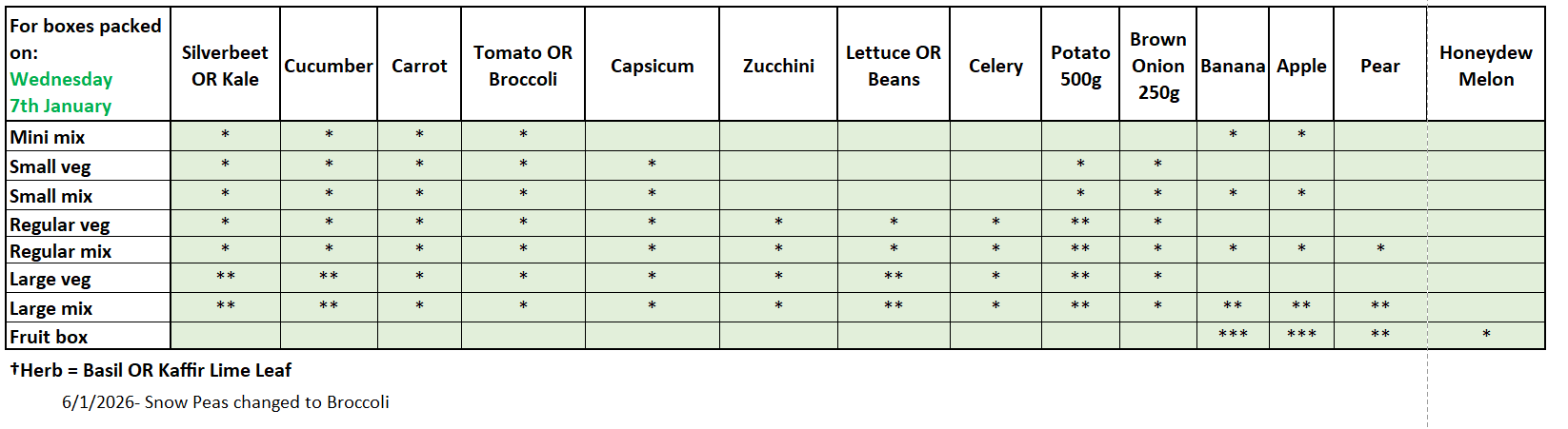 Please Note: Occasionally we need to adjust what we pack in boxes based on the quantity or quality of produce that we can harvest and source.